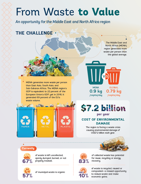 - The MENA region generates more waste per person per day than the global average (0.9kg/person/day compared to 0.79 kg/person/day)